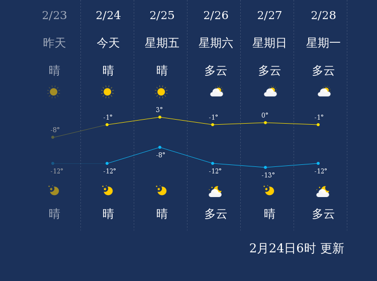 预计,今天白天晴,最高气温-1℃,微风,今天夜间晴,最低气温-12℃,微风。