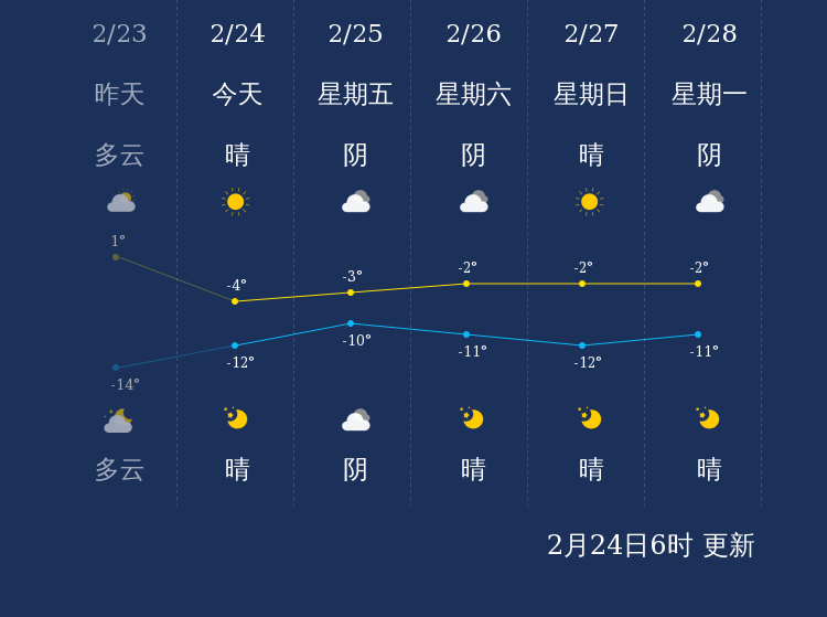 预计,今天白天晴,最高气温-4℃,微风,今天夜间晴,最低气温-12℃,微风。