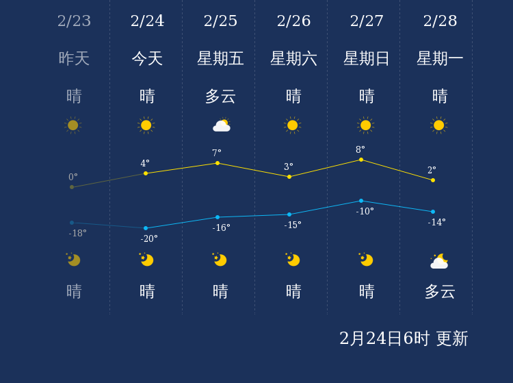 预计,今天白天晴,最高气温4℃,微风,今天夜间晴,最低气温-20℃,微风。