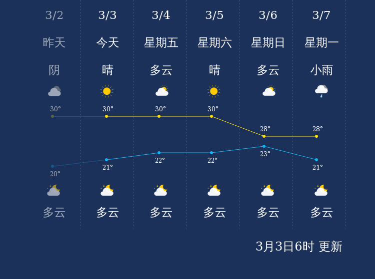 预计,今天白天晴,最高气温30℃,微风,今天夜间多云,最低气温21℃,微风。