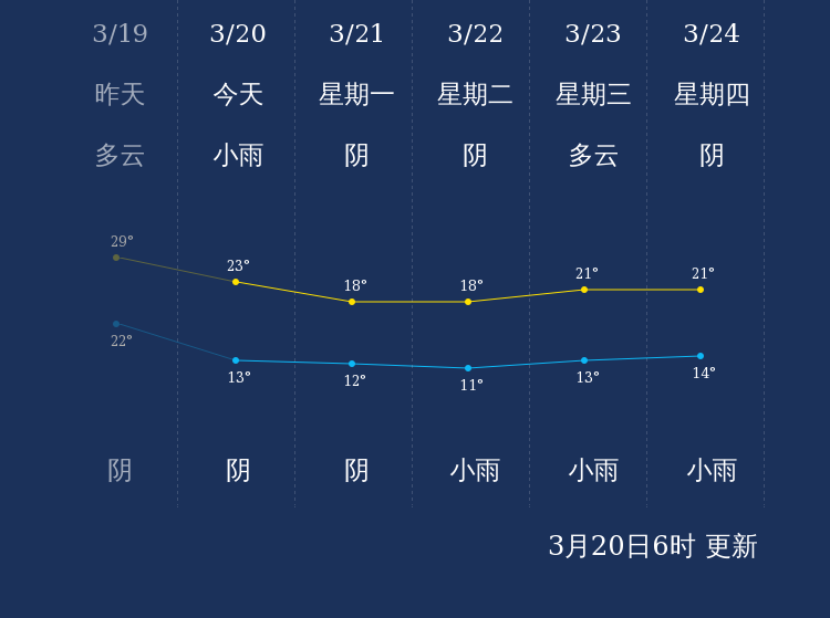 预计,今天白天小雨,最高气温23℃,微风,今天夜间阴,最低气温13℃,微风。