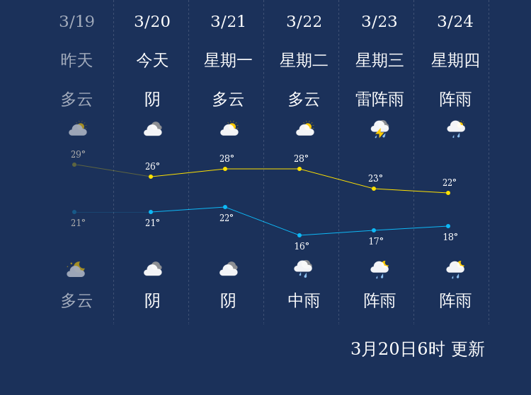 预计,今天白天阴,最高气温26℃,东风4-5级,今天夜间阴,最低气温21℃,微风。