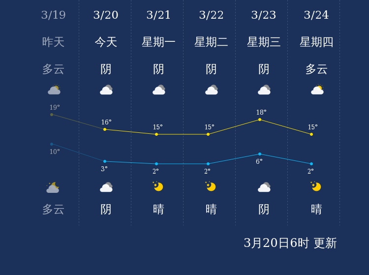 预计,今天白天阴,最高气温16℃,微风,今天夜间阴,最低气温3℃,微风。