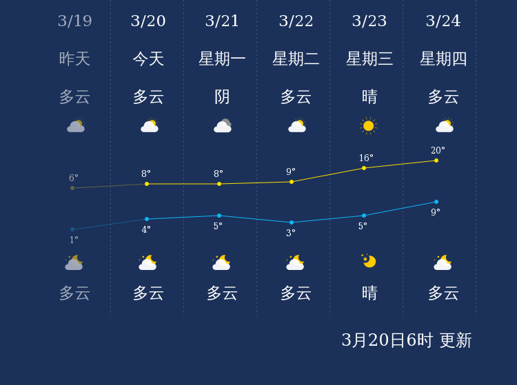 预计,今天白天多云,最高气温8℃,微风,今天夜间多云,最低气温4℃,微风。