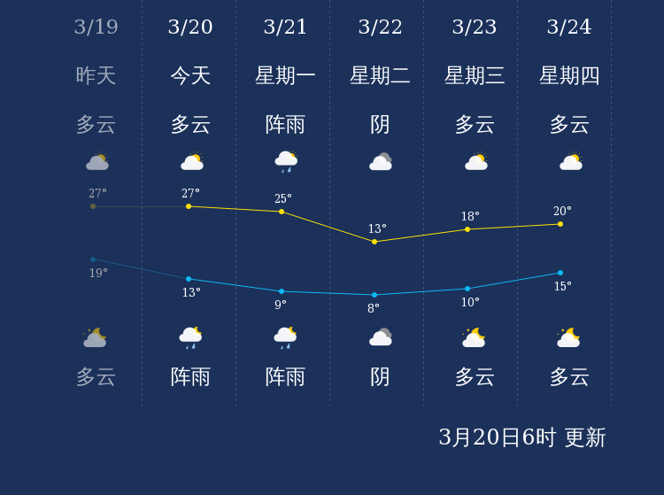 预计,今天白天多云,最高气温27℃,南风3-4级,今天夜间阵雨,最低气温13℃,微风。