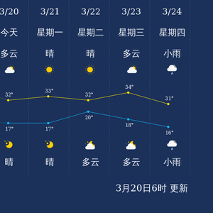 预计,今天白天多云,最高气温32℃,微风,今天夜间晴,最低气温17℃,微风。