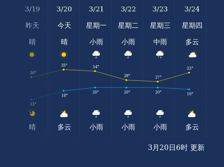 预计,今天白天晴,最高气温35℃,微风,今天夜间多云,最低气温18℃,微风。