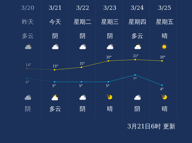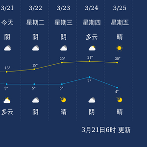 预计,今天白天阴,最高气温13℃,微风,今天夜间多云,最低气温5℃,微风。