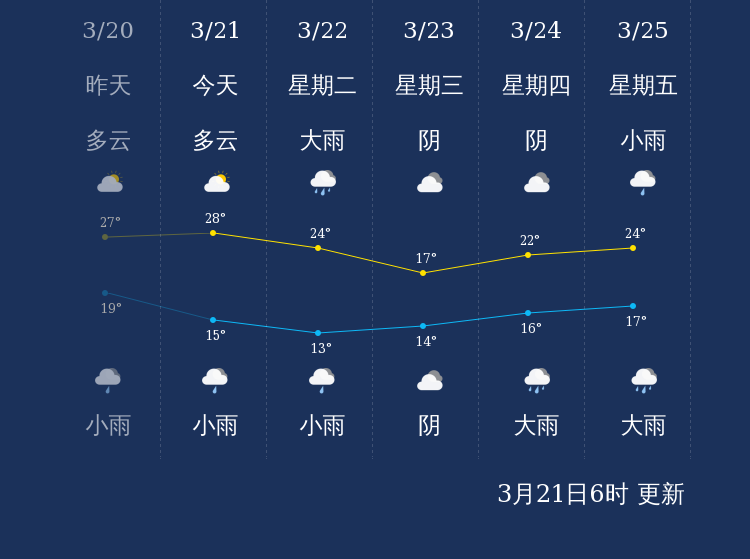 预计,今天白天多云,最高气温28℃,微风,今天夜间小雨,最低气温15℃,微风。
