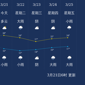 - 雨水频繁:预计本周或有3天降雨天气,且雨势较大。由于预报时效较远,还需关注临近预报,及时调整出行计划。