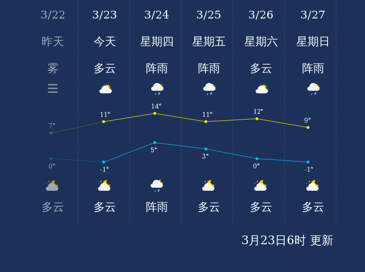 预计,今天白天多云,最高气温11℃,西南风4-5级,今天夜间多云,最低气温-1℃,南风3-4级。