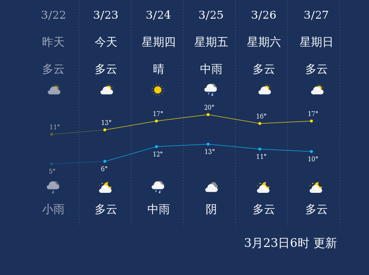 预计,今天白天多云,最高气温13℃,微风,今天夜间多云,最低气温6℃,东南风3-4级。