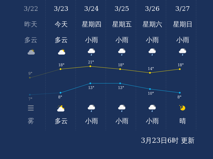 预计,今天白天多云,最高气温18℃,微风,今天夜间多云,最低气温8℃,微风。