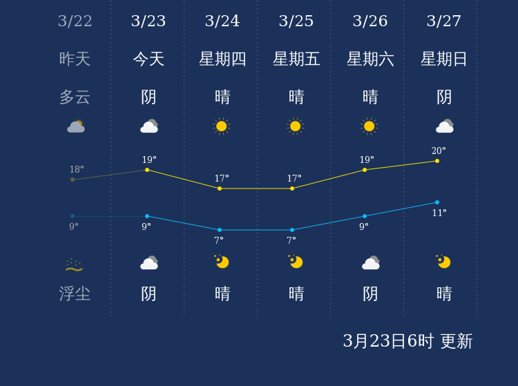 预计,今天白天阴,最高气温19℃,微风,今天夜间阴,最低气温9℃,微风。