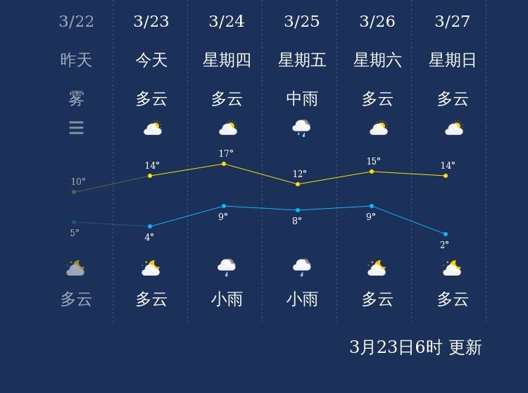预计,今天白天多云,最高气温14℃,微风,今天夜间多云,最低气温4℃,微风。