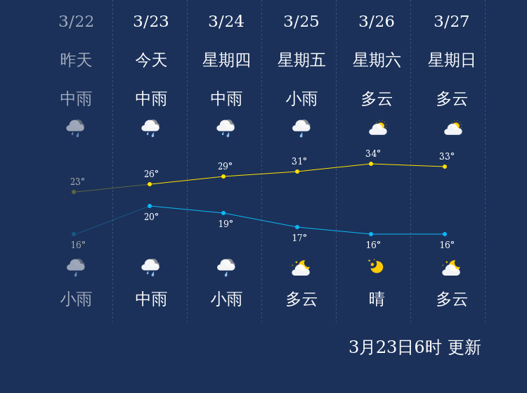 预计,今天白天中雨,最高气温26℃,微风,今天夜间中雨,最低气温20℃,微风。