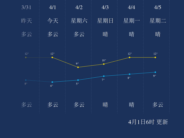 预计,今天白天多云,最高气温12℃,北风3-4级,今天夜间多云,最低气温4℃,南风3-4级。