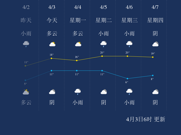 预计,今天白天小雨,最高气温11℃,西北风3-4级,今天夜间多云,最低气温4℃,微风。