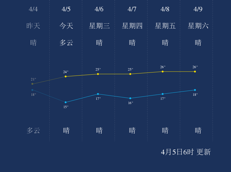 预计,今天白天多云,最高气温24℃,微风,今天夜间晴,最低气温15℃,微风。