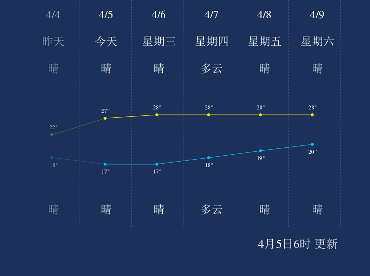 预计,今天白天晴,最高气温27℃,微风,今天夜间晴,最低气温17℃,微风。