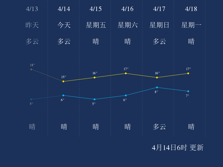中国天气网讯 今天是4月14日星期四,一起来看天气。