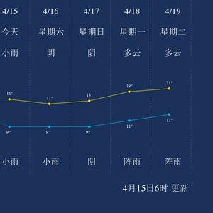 预计,今天白天小雨,最高气温14℃,微风,今天夜间小雨,最低气温9℃,微风。