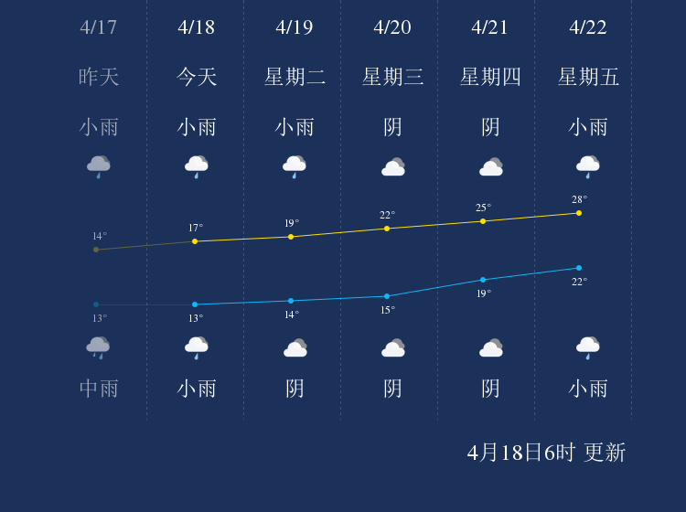 预计,今天白天小雨,最高气温17℃,微风,今天夜间小雨,最低气温13℃,微风。