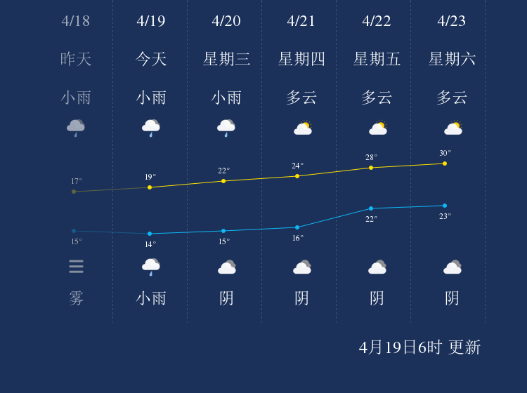 中国天气网讯 今天是4月19日星期二,一起来看天气。