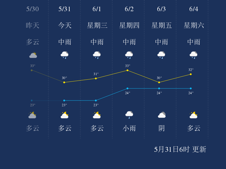 预计,今天白天中雨,最高气温30℃,微风,今天夜间多云,最低气温23℃,微风。