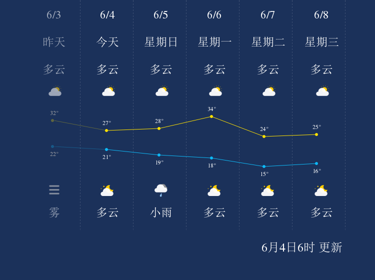 预计,今天白天多云,最高气温32℃,东南风3-4级,今天夜间多云,最低气温21℃,微风。