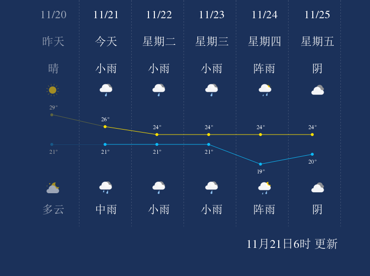 预计,今天白天小雨,最高气温26℃,微风,今天夜间中雨,最低气温21.6℃,东风3-4级。