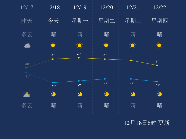 预计,今天白天晴,最高气温-3.2℃,西风3-4级,今天夜间晴,最低气温-22.5℃,微风。