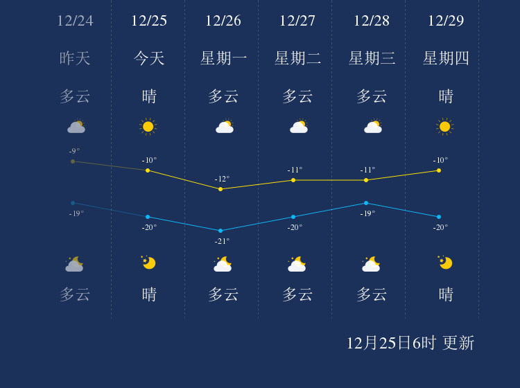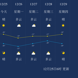 预计,今天白天晴,最高气温-10℃,北风3-4级,今天夜间晴,最低气温-20℃,微风。
