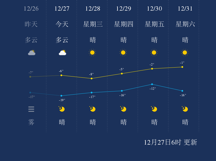 预计,今天白天多云,最高气温-6℃,微风,今天夜间晴,最低气温-19℃,微风。