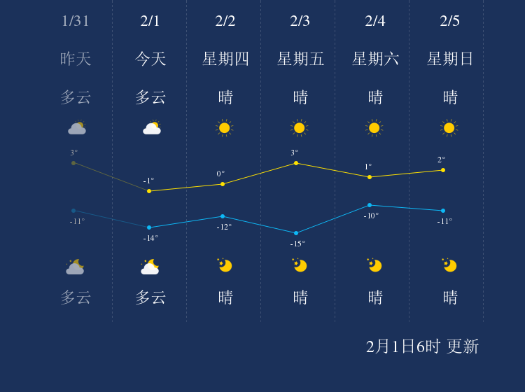 预计,今天白天多云,最高气温-1℃,微风,今天夜间多云,最低气温-14℃,微风。