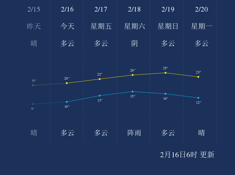 2月16日广州天气早知道 中国天气 中国天气网 2023.02.1607:16 关注 中国天气网讯 今天是2月16日星期四,一起来看天气。今晨6时,广州晴,气温10℃,东北风4-5级,相对湿度61%。预计,今天白天多云,最高气温20.7℃,微风,今天夜间多云,最低气温10.6℃,微风。