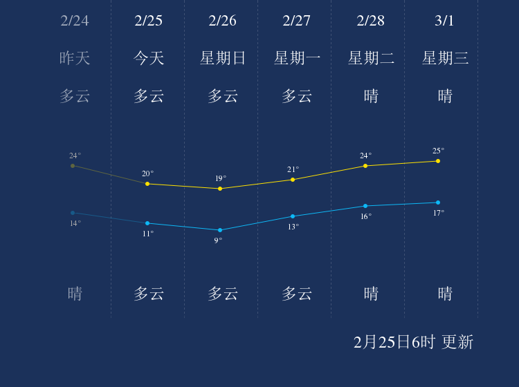 中国天气网讯 今天是2月25日星期六,一起来看天气。