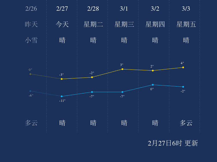 2月27日乌鲁木齐天气早知道 中国天气 中国天气网 2023.02.2707:15 关注 中国天气网讯 今天是2月27日星期一,一起来看天气。今晨6时,乌鲁木齐晴,气温-6℃,南风3-4级,相对湿度86%。预计,今天白天晴,最高气温-3℃,微风,今天夜间晴,最低气温-11℃,微风。