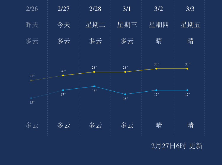 2月27日乐东天气早知道 中国天气 中国天气网 2023.02.2707:18 关注 中国天气网讯 今天是2月27日星期一,一起来看天气。今晨6时,乐东晴,气温16℃,西北风4-5级,相对湿度70%。预计,今天白天多云,最高气温26.9℃,微风,今天夜间多云,最低气温17℃,微风。