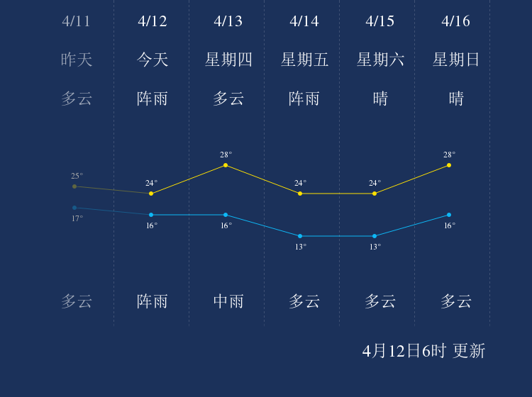 4月12日贵阳天气早知道 中国天气 中国天气网 2023.04.1207:17 关注 中国天气网讯 今天是4月12日星期三,一起来看天气。预计,今天白天阵雨,最高气温24.2℃,微风,今天夜间阵雨,最低气温16.4℃,微风。近期重点天气提示:降水提醒:预计今天有阵雨、明天有多云转中雨。出门记得带伞并注意交通安全。