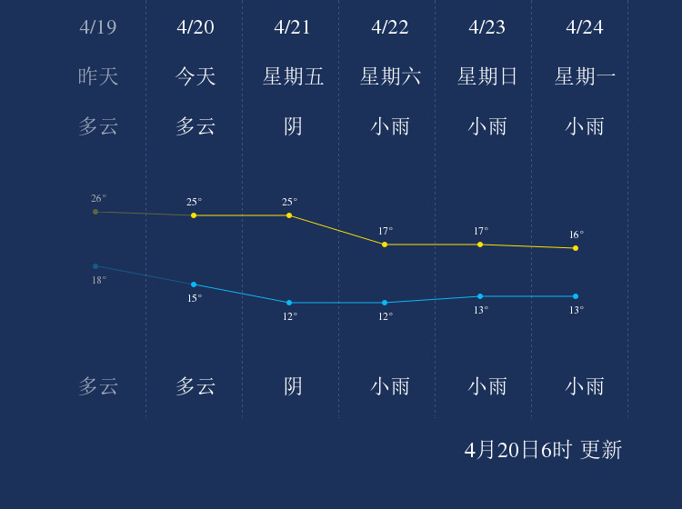 预计,今天白天多云,最高气温25.3℃,东风4-5级,今天夜间多云,最低气温15.6℃,东北风3-4级。
