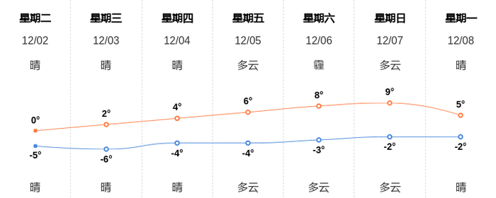 12月2日天津天气早知道 新浪新闻 新浪新闻官方账号 2025.12.0207:15 关注 今天是12月2日星期二,一起来看天气。预计今天白天晴,最高气温0℃,北风2级,今天夜间晴,最低气温-5℃,北风2级。空气质量方面,AQI指数19,空气质量为优。空气质量令人满意,充满新鲜空气。
