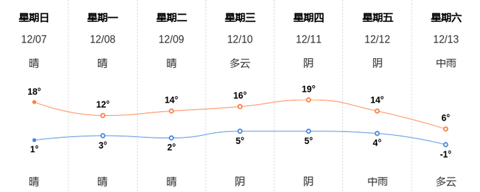 预计今天白天晴,最高气温18℃,北风2级,今天夜间晴,最低气温1℃,北风2级。