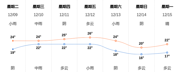 12月9日文昌天气早知道 新浪新闻 新浪新闻官方账号 2025.12.0907:18 关注 今天是12月9日星期二,一起来看天气。预计今天白天小雨,最高气温24℃,东北风2级,今天夜间阴,最低气温19℃,东北风2级。空气质量方面,AQI指数48,空气质量为优。空气质量令人满意,充满新鲜空气。