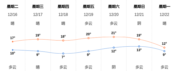 预计今天白天晴,最高气温17℃,东北风1级,今天夜间多云,最低气温10℃,东北风1级。