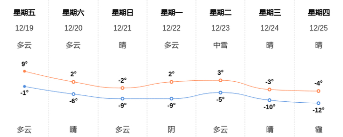 12月19日盘锦天气早知道 新浪新闻 新浪新闻官方账号 2025.12.1907:15 关注 今天是12月19日星期五,一起来看天气。预计今天白天多云,最高气温9℃,南风3级,今天夜间多云,最低气温-1℃,南风3级。空气质量方面,AQI指数27,空气质量为优。空气质量令人满意,充满新鲜空气。