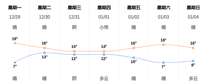 预计今天白天晴,最高气温19℃,北风1级,今天夜间晴,最低气温7℃,北风1级。