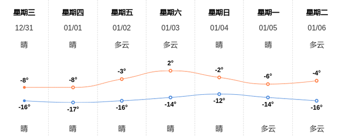 12月31日阜新天气早知道 新浪新闻 新浪新闻官方账号 2025.12.3107:15 关注 今天是12月31日星期三,一起来看天气。预计今天白天晴,最高气温-8℃,西北风2级,今天夜间晴,最低气温-16℃,西北风2级。空气质量方面,AQI指数34,空气质量为优。空气质量令人满意,充满新鲜空气。