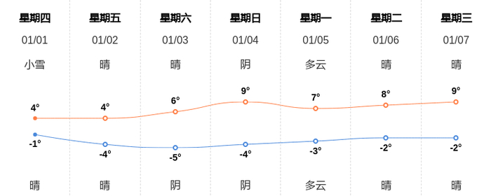 1月1日扬州天气早知道 新浪新闻 新浪新闻官方账号 01.0107:16 关注 今天是1月1日星期四,一起来看天气。预计今天白天小雪,最高气温4℃,北风2级,今天夜间晴,最低气温-1℃,北风2级。空气质量方面,AQI指数18,空气质量为优。空气质量令人满意,充满新鲜空气。