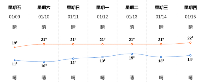 1月9日广州天气早知道 新浪新闻 新浪新闻官方账号 01.0907:16 关注 今天是1月9日星期五,一起来看天气。预计今天白天晴,最高气温19℃,北风2级,今天夜间晴,最低气温11℃,北风2级。空气质量方面,AQI指数34,空气质量为优。空气质量令人满意,充满新鲜空气。